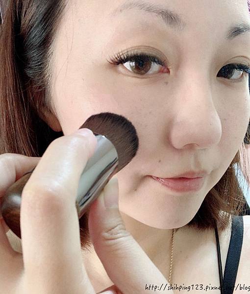 將粉底沾在粉底刷上,粉底的質地是有光澤的水潤感,量不用多,非常好延展
